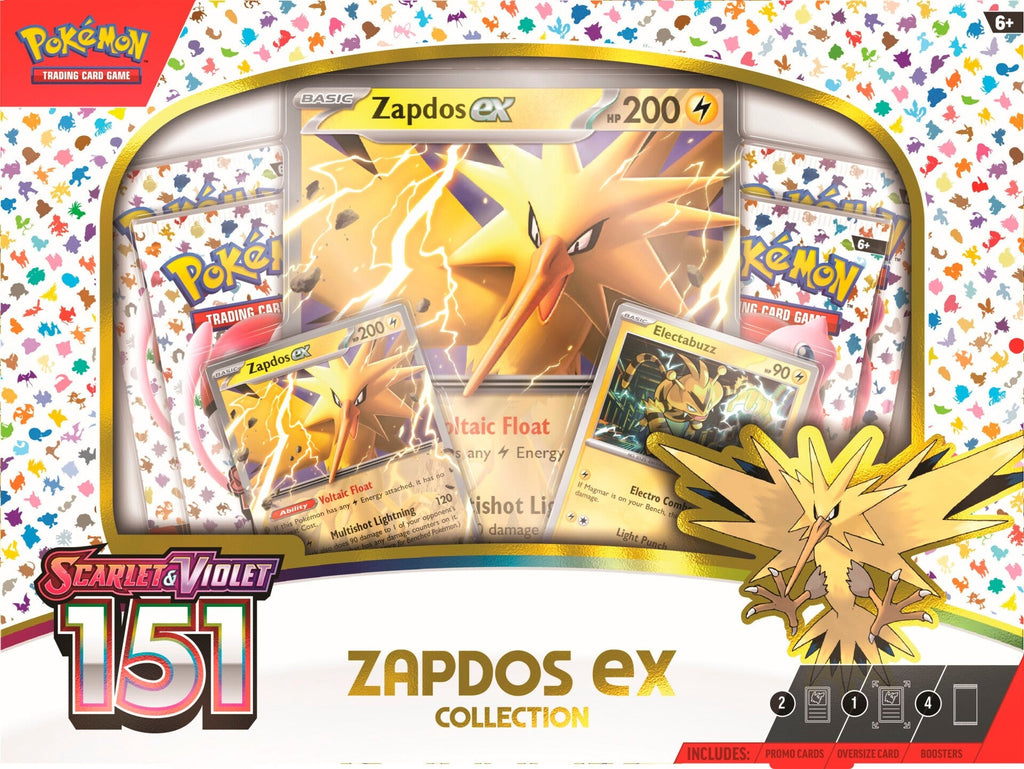 Strike with electrifying power and then retreat as fast as lightning with Zapdos ex! This Legendary Pokémon of the Kanto region is here as a ready-to-play promo card and an oversize card for your collection, along with a foil card featuring Electabuzz, and more Pokémon inside booster packs from the special Scarlet & Violet—151 expansion.